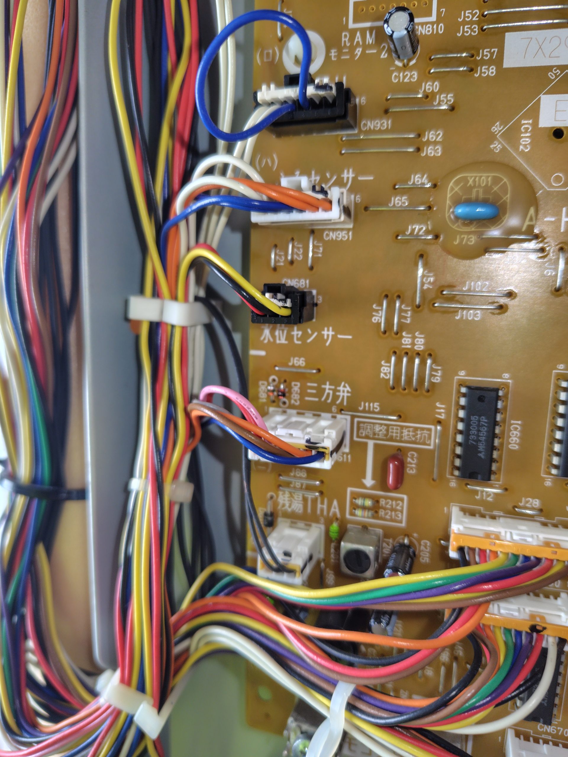 全面パネルを外し、故障していると思しき部品を取り外してみる。(基盤に三方弁のコネクタがあるので、たどっていけばたどりつけるはず)