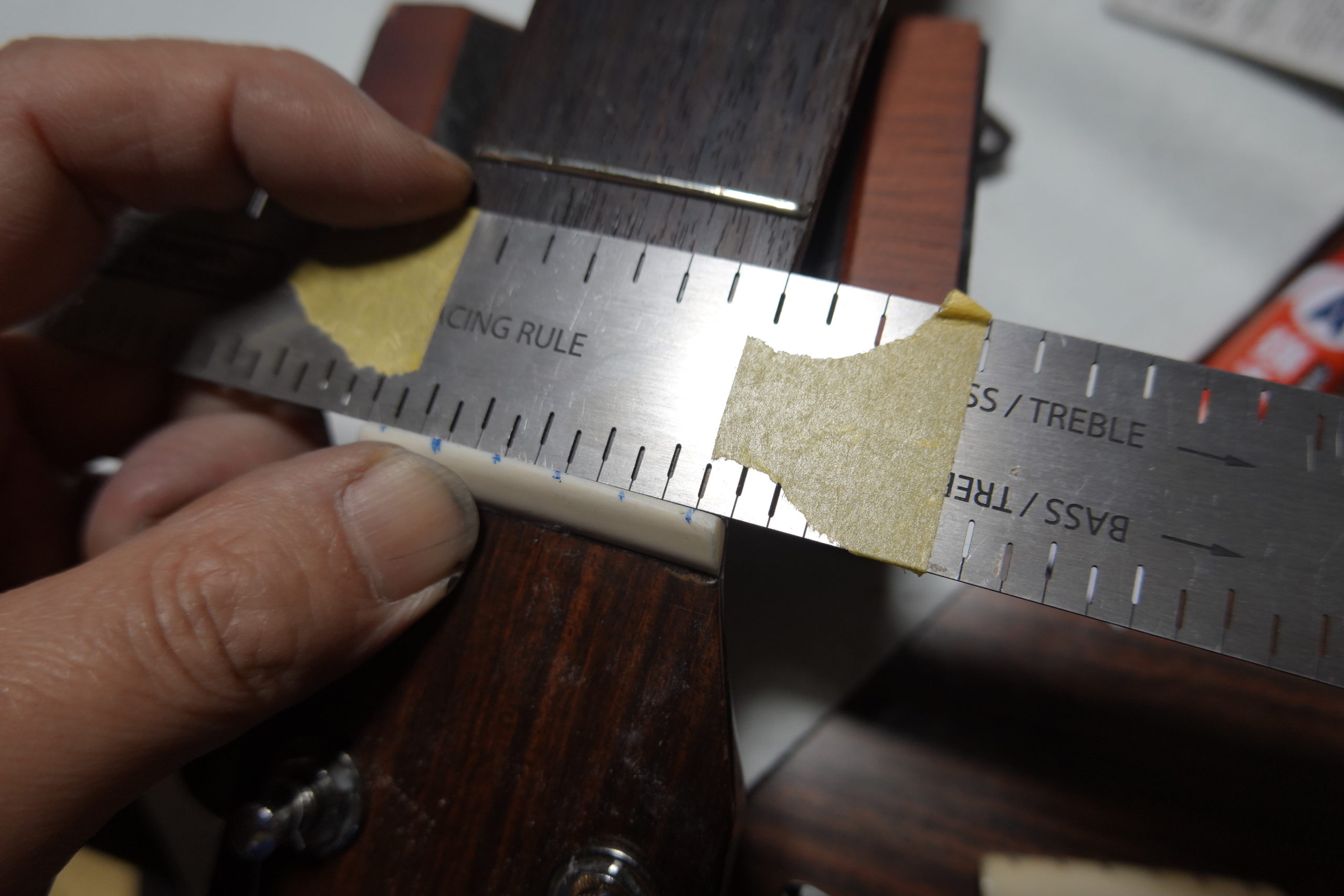 他の43mmナットのギターで弾きやすいものからスチュマック社の専用定規を使って設定を移します。(間隔さえ合っていれば、計算して均等に印をつければOK)
